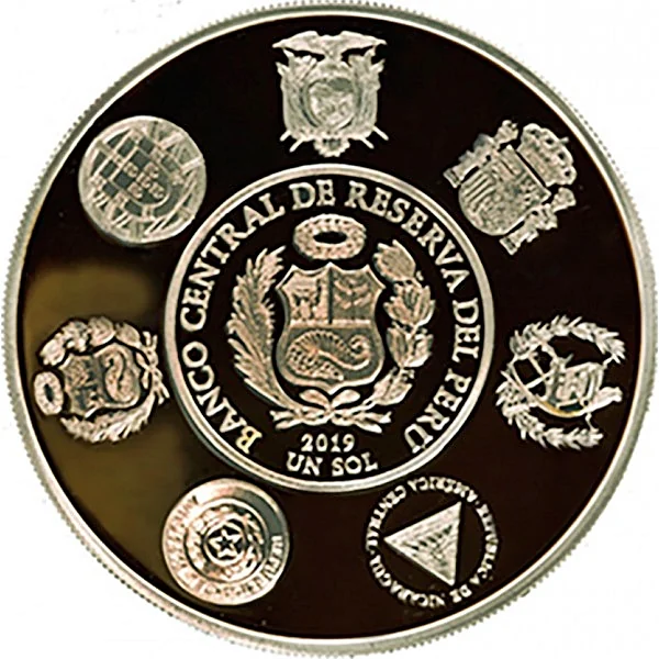 Peru's coat of arms encircled by the legend "BANCO CENTRAL DE RESERVA DEL PERU" and the issue date, surrounded by the emblems of all coining nations in the 12th series.