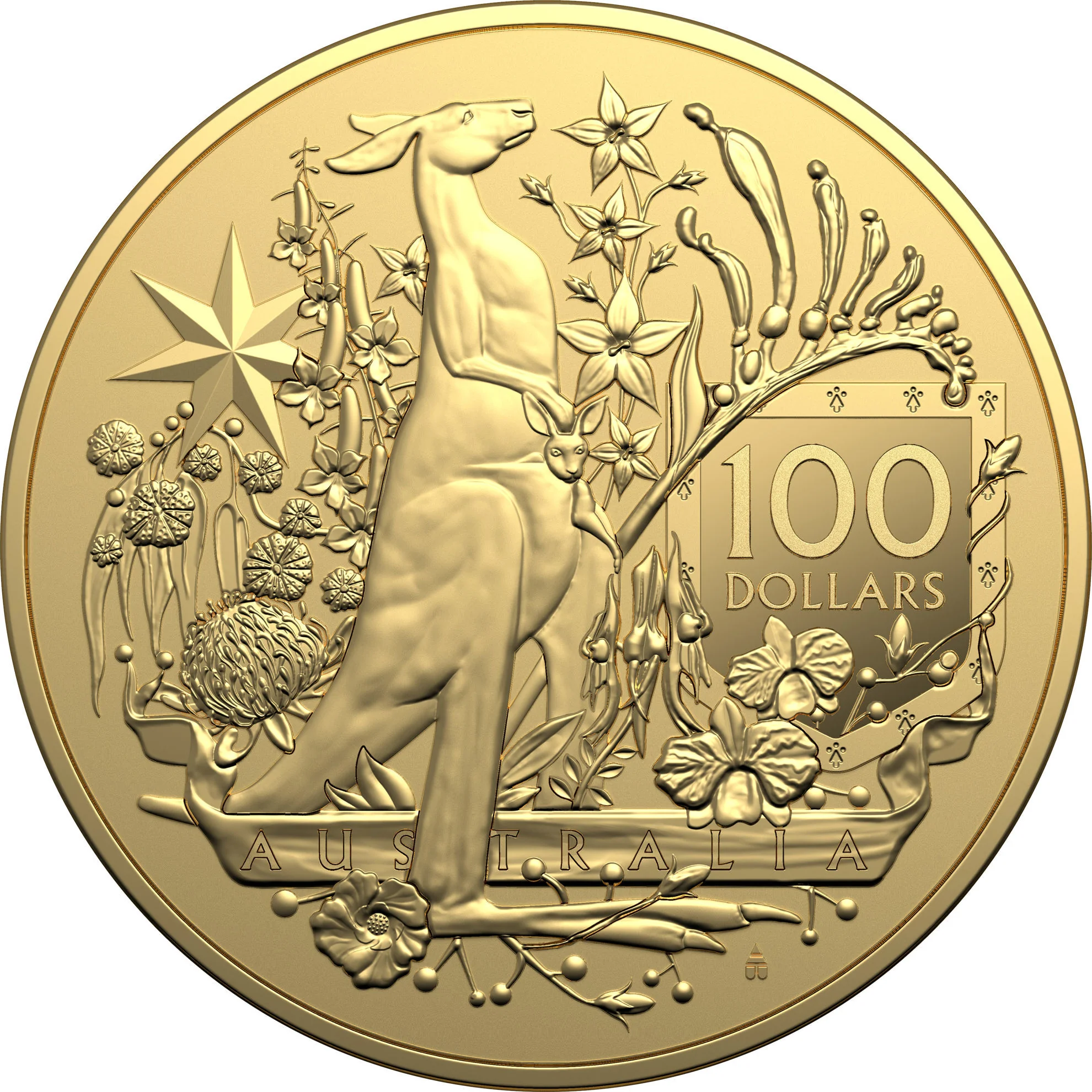 A left-facing kangaroo with a joey in its pouch, set among Australian flora beside a seven-pointed star.