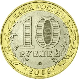 The central disc features the face value "10 РУБЛЕЙ". Within the "0", hidden images of "10" and "РУБ" appear alternately when tilted. The mint mark is below. The ring bears "БАНК РОССИИ" above and "2005" below, with laurel and oak branches extending onto the disc from the sides.