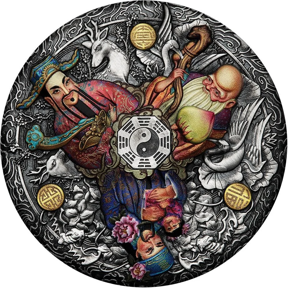 Description: Fu, Lu, and Shou surround a yin yang symbol. Fu (prosperity) is a learned man holding a baby, with peonies and the character 福. Lu (success) is a mandarin with a *ruyi* sceptre and a sycee ingot, with the character 禄. Shou (longevity) is a wise old man with a high forehead, a crooked staff, and a peach, with the character 寿.
