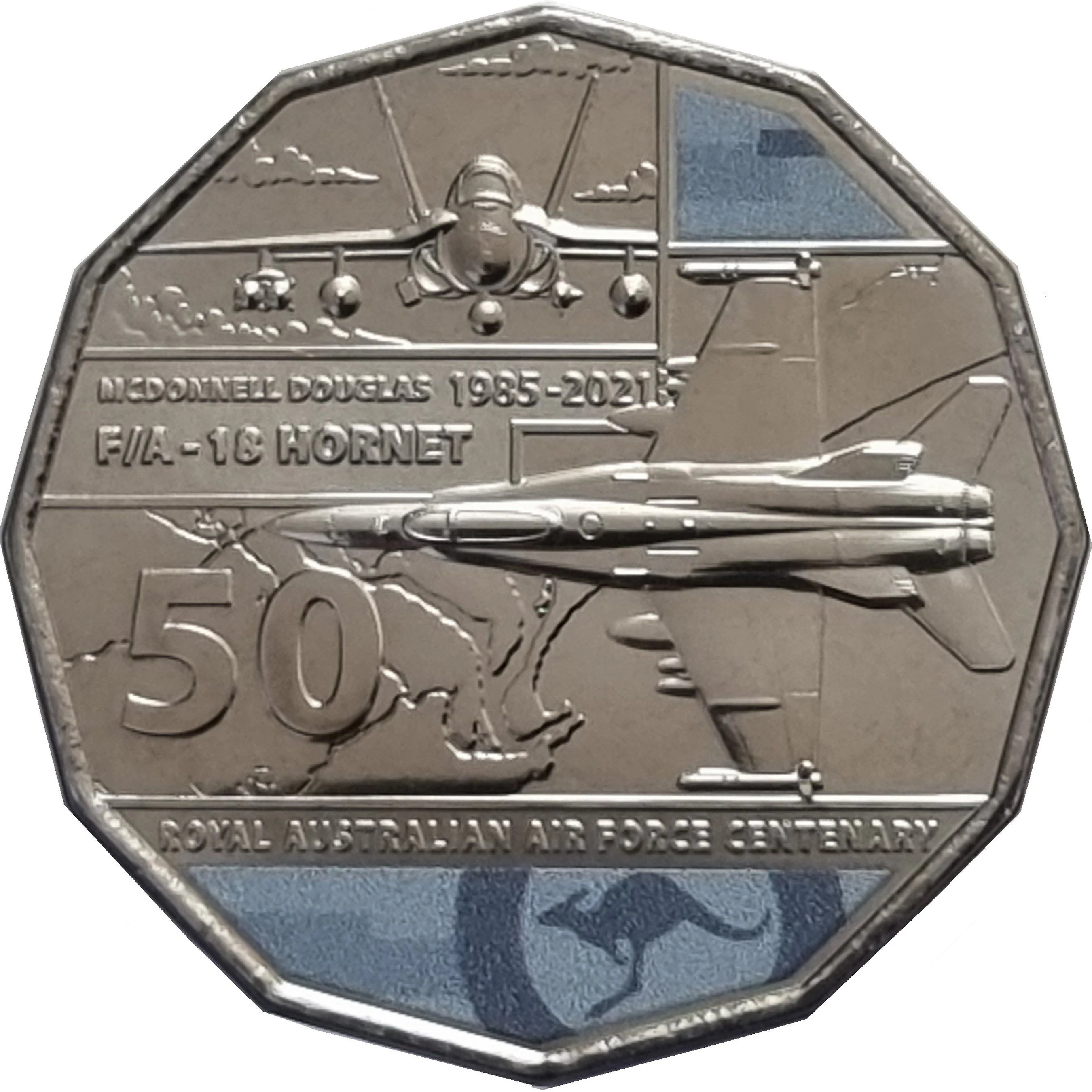 Front and top views of an RAAF F/A-18 Hornet with light blue and kangaroo markings. Denomination at left.