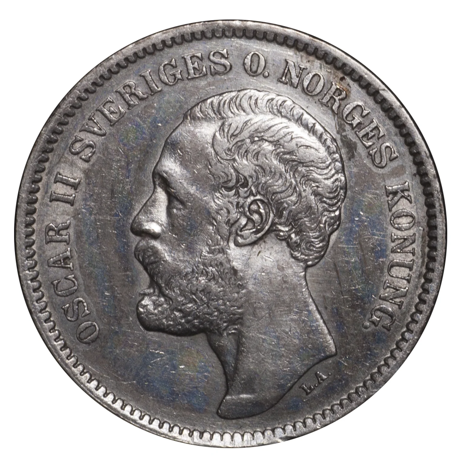 King Oscar II facing left, engraver initials below neck, legend around rim.