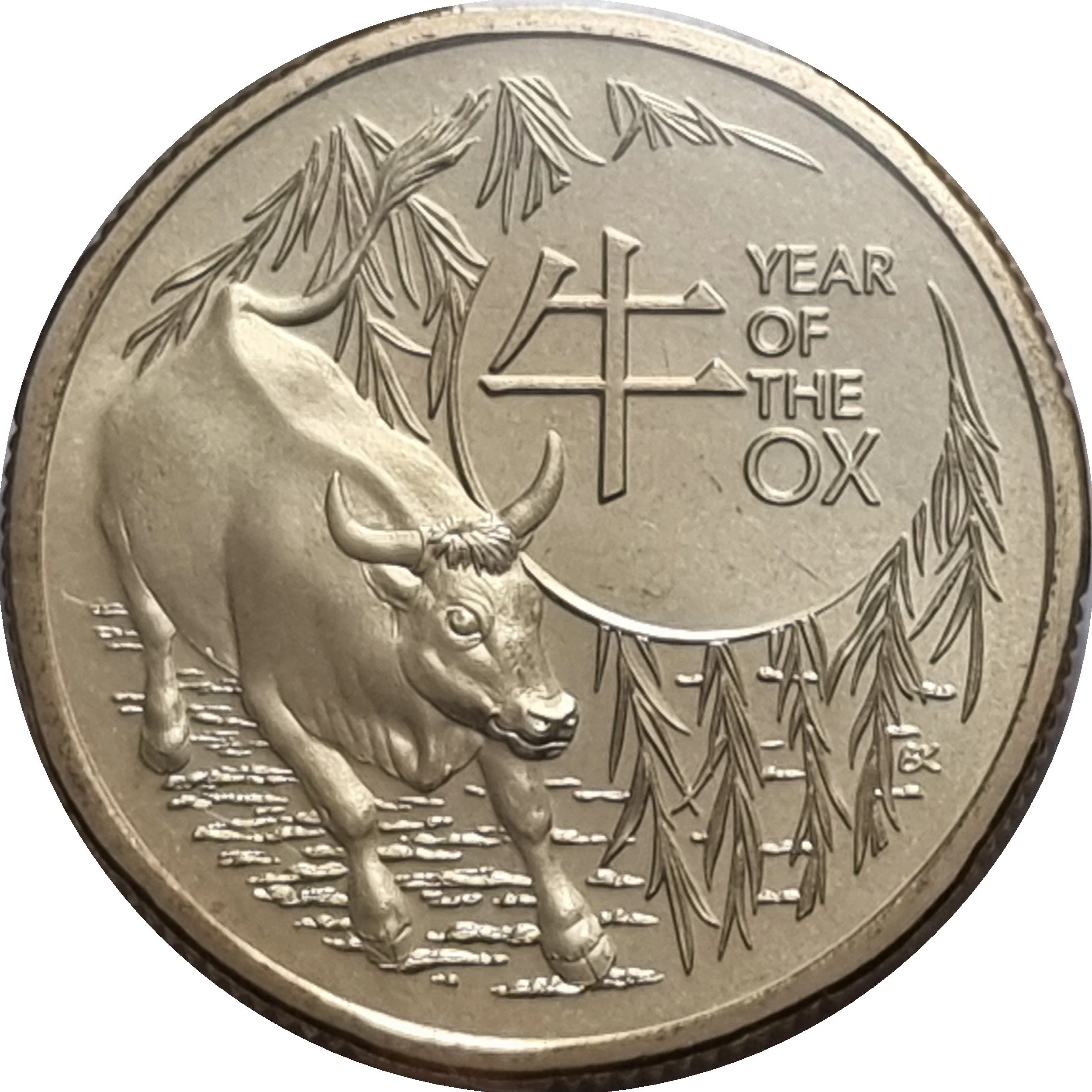 A young ox standing under foliage, front legs outstretched. To the right, the Chinese symbol for Ox in a circle.