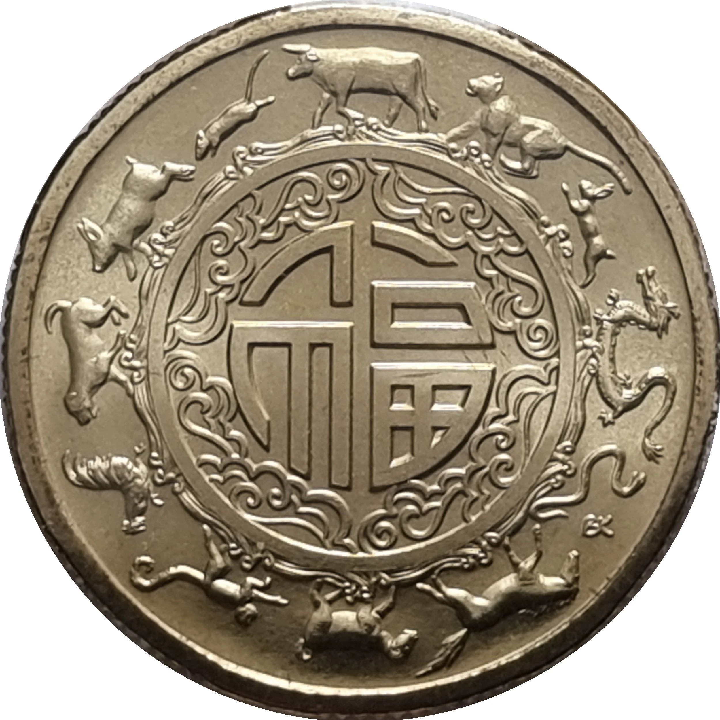 An inner circle with the Chinese character for Good Fortune and Luck, surrounded by the 12 Lunar Animals, starting with the Ox at the top.