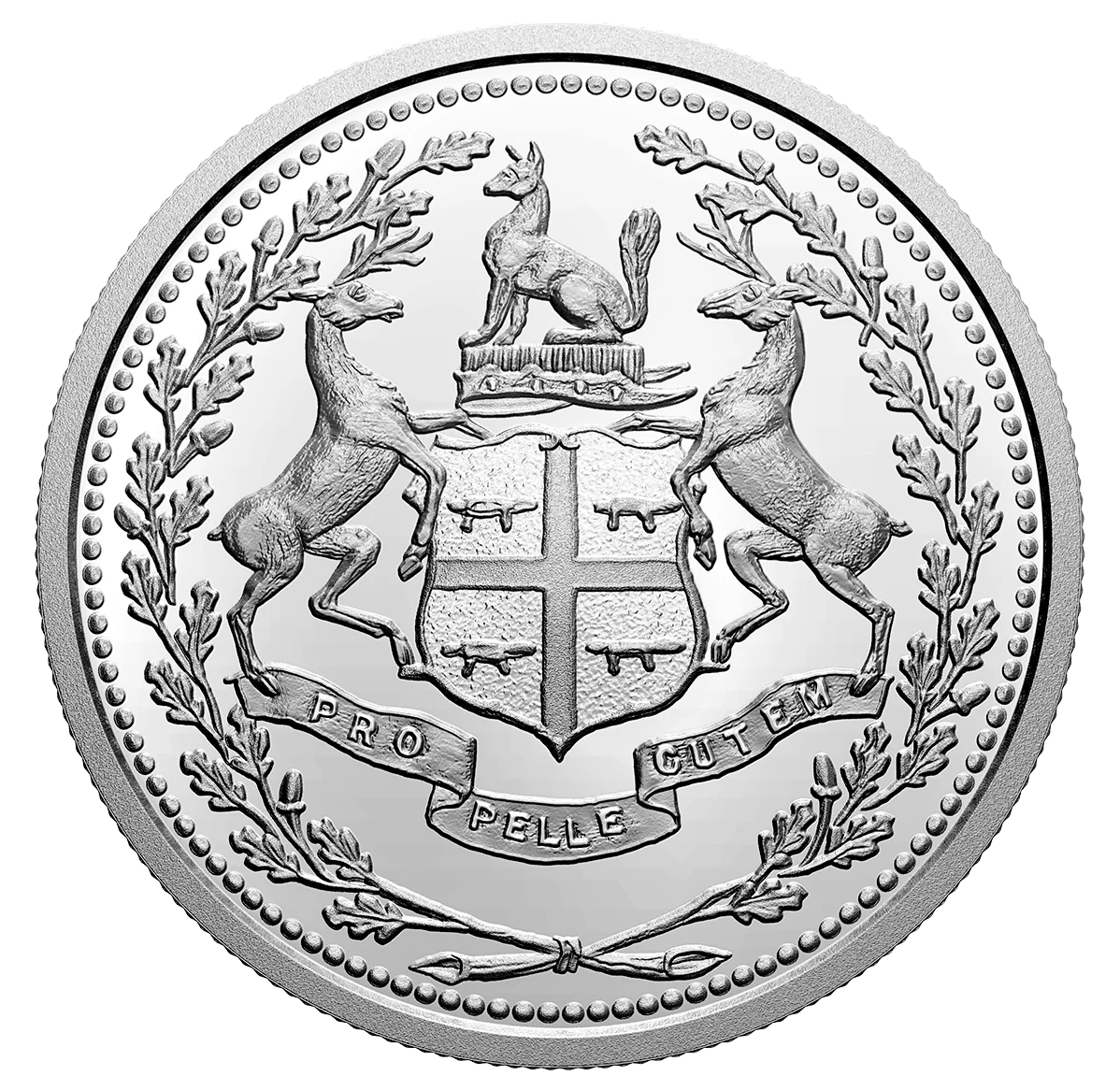 The reverse faithfully reproduces a 19th-century Hudson's Bay Company fur trade token. It features the company coat of arms—a silver shield with St. George's cross and four beavers, supported by elk and topped by a fox on a cap of maintenance—all within an oak wreath. The motto "PRO PELLE CUTEM" appears on a banderole below.