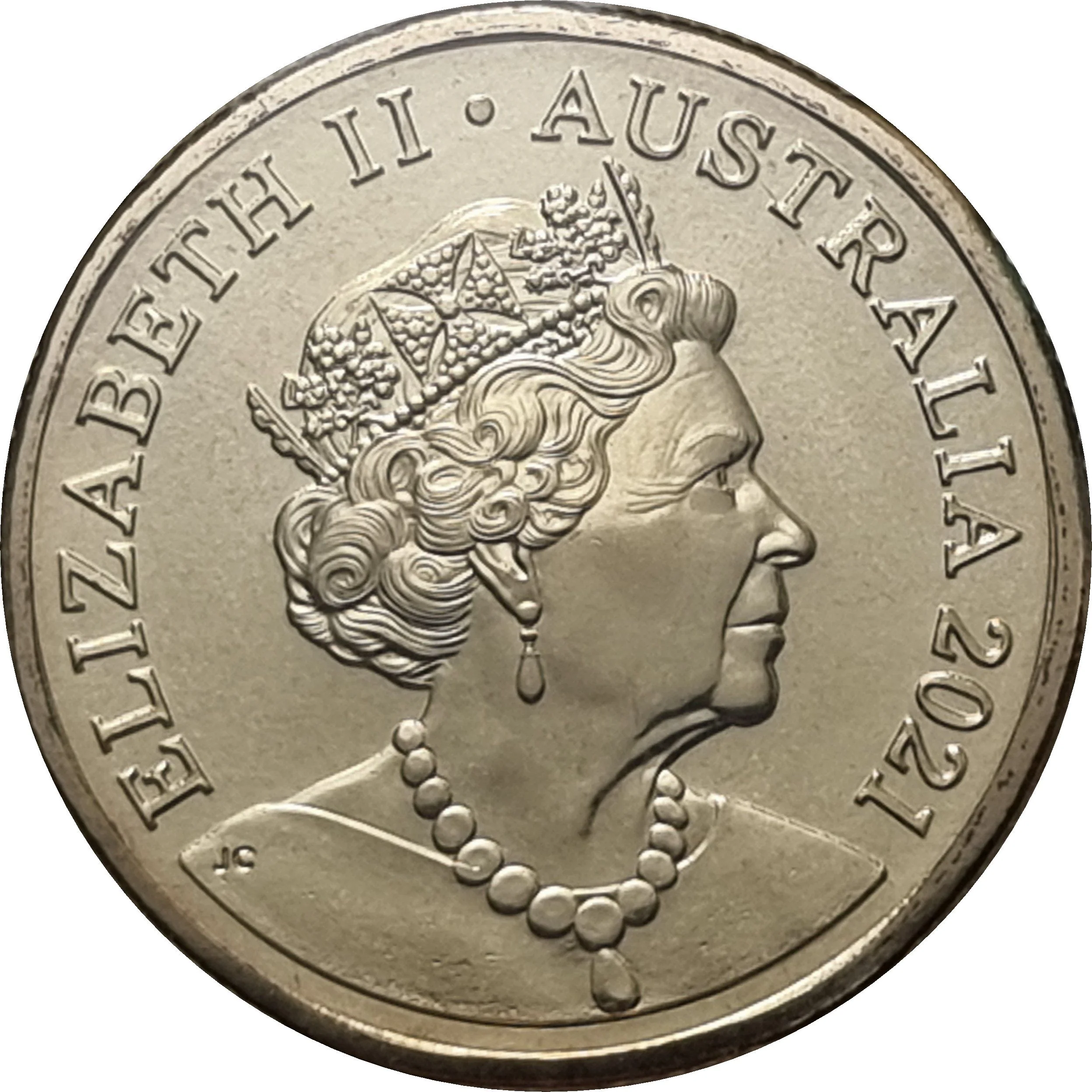 Queen Elizabeth VI in profile, wearing the George IV State Diadem and Victorian Coronation Necklace.