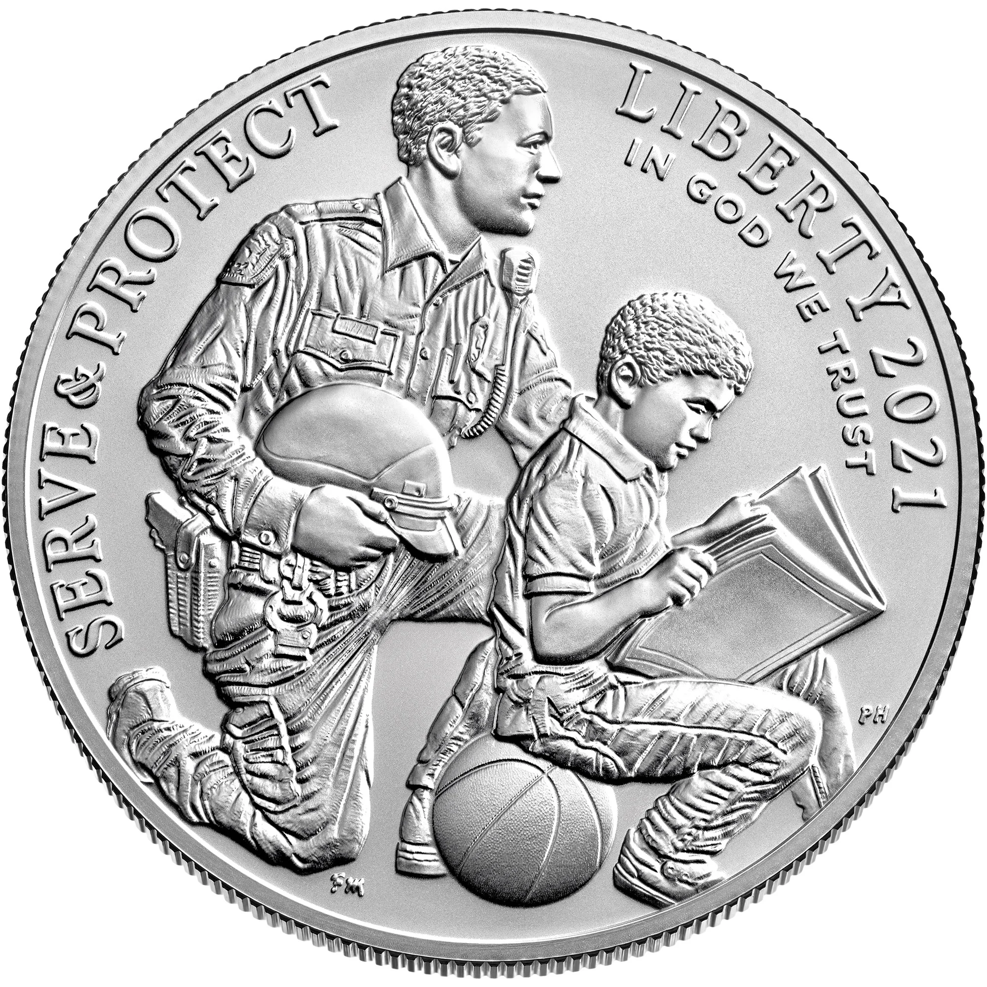 A police officer kneels beside a child reading on a basketball, symbolizing community service and investment in the future.