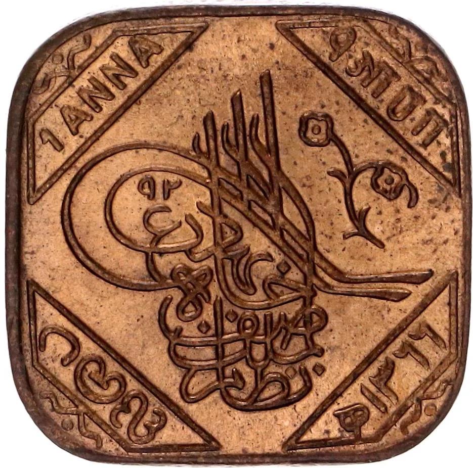 Tughra 92. 1 Anna coin with "Asaf Jah Nizam Al-Mulk Bahadur" in three languages (three corners) and an AH date (bottom right).