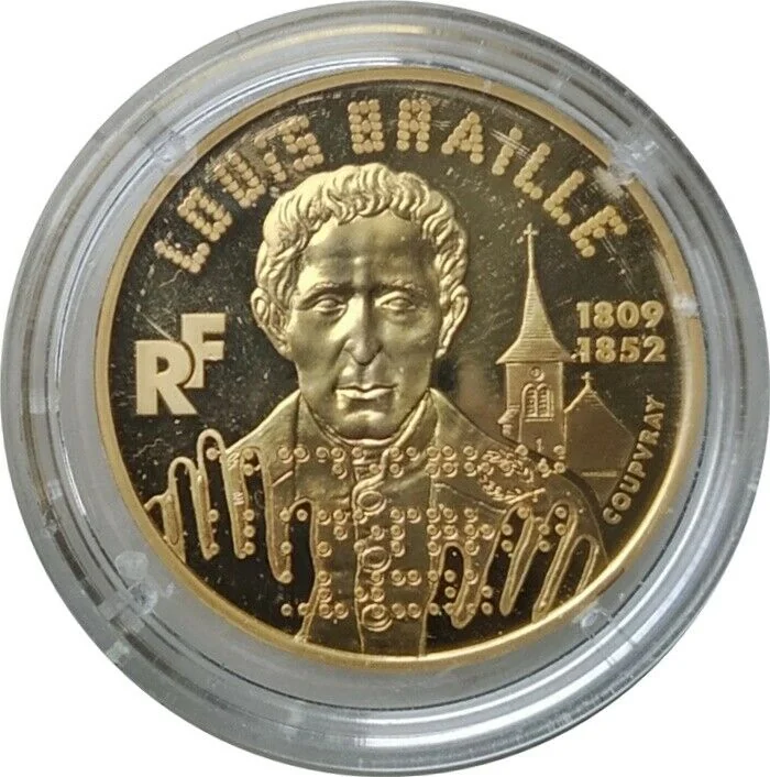 Louis Braille portrait with church and dates. Hands over Braille text.