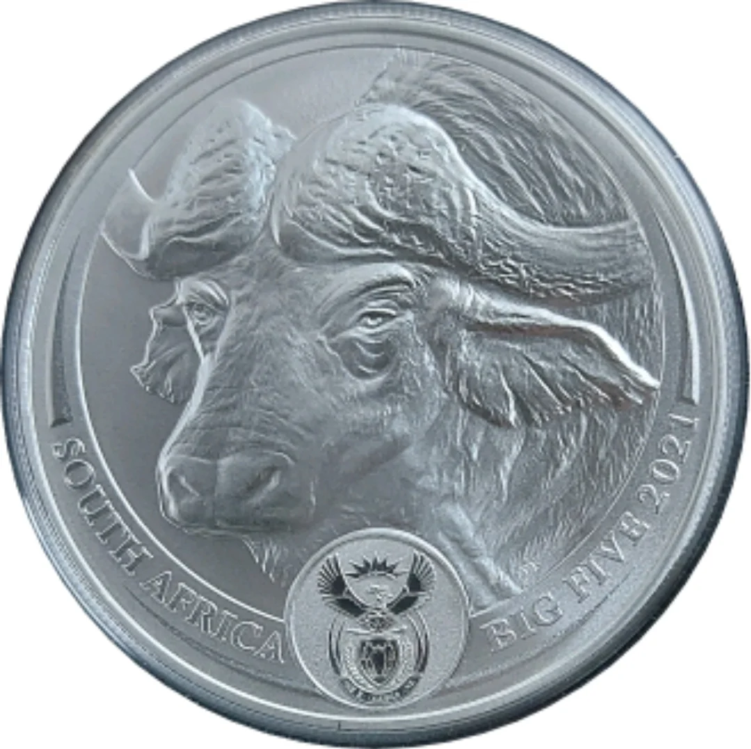 Buffalo facing left, South African coat of arms centered below, lettering flanking it.