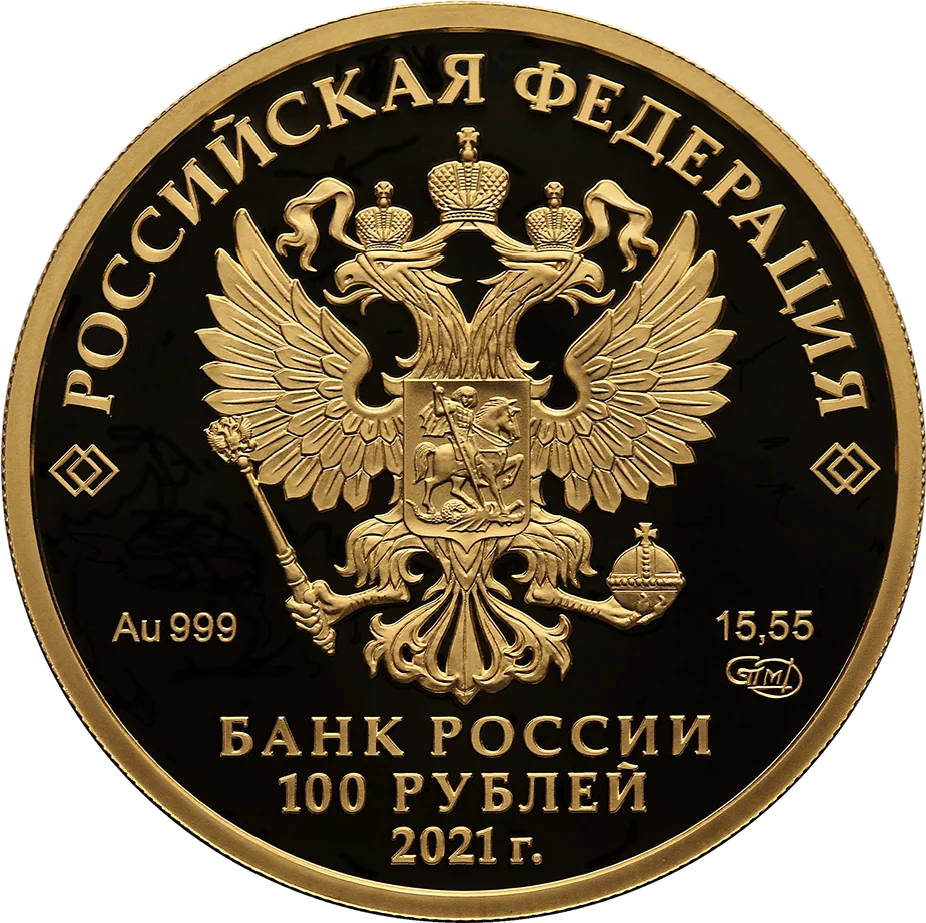 The obverse features the Russian Federation coat of arms with the inscription "РОССИЙСКАЯ ФЕДЕРАЦИЯ" above. Below are the metal specifications and mint mark flanking the emblem, with "БАНК РОССИИ", "100 РУБЛЕЙ", and "2021 г." at the bottom.
