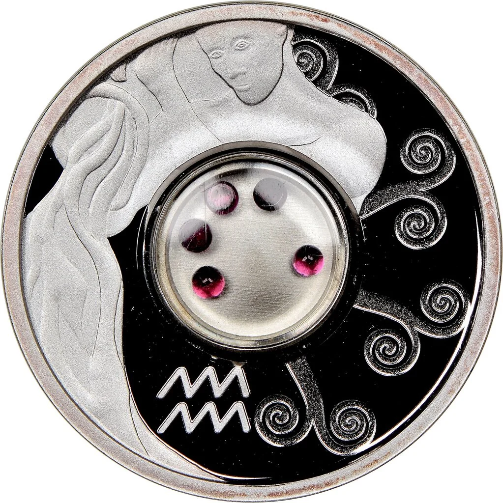 Aquarius symbol background with central garnets.