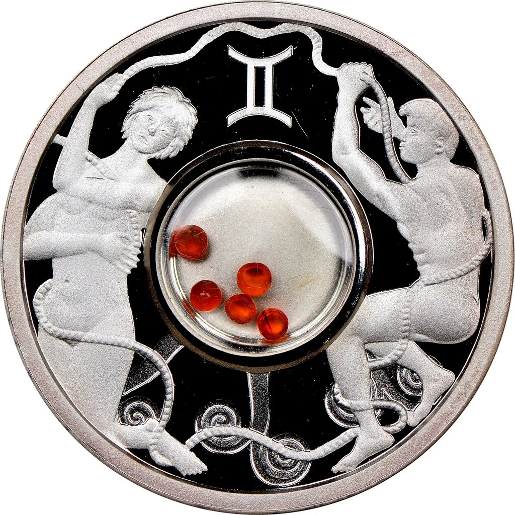 Twins and ♊︎ symbol with central red gemstones.