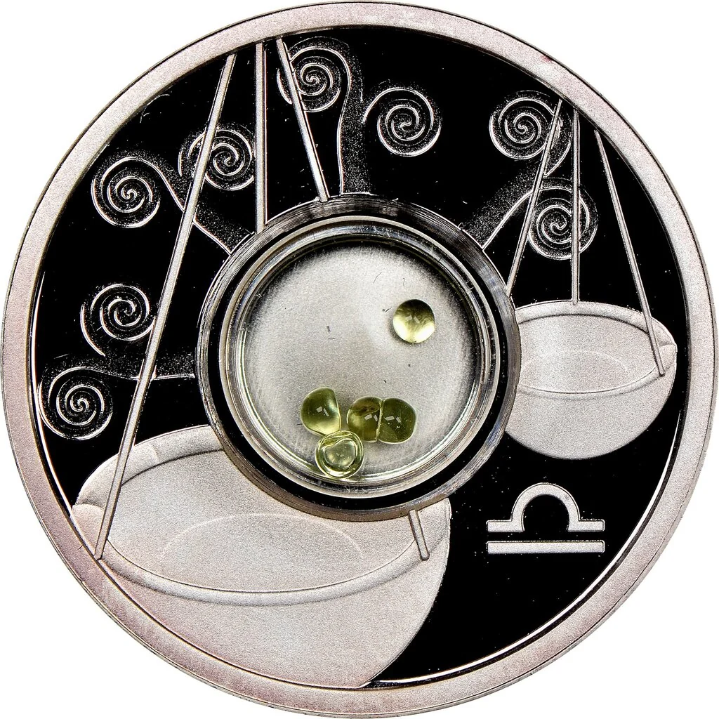 Libra scales with a ♎︎ symbol and central pale-green gemstones.