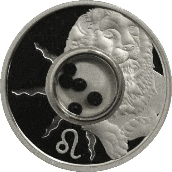 Lion and ♌︎ symbol for Leo. Encapsulated black gemstones in centre.