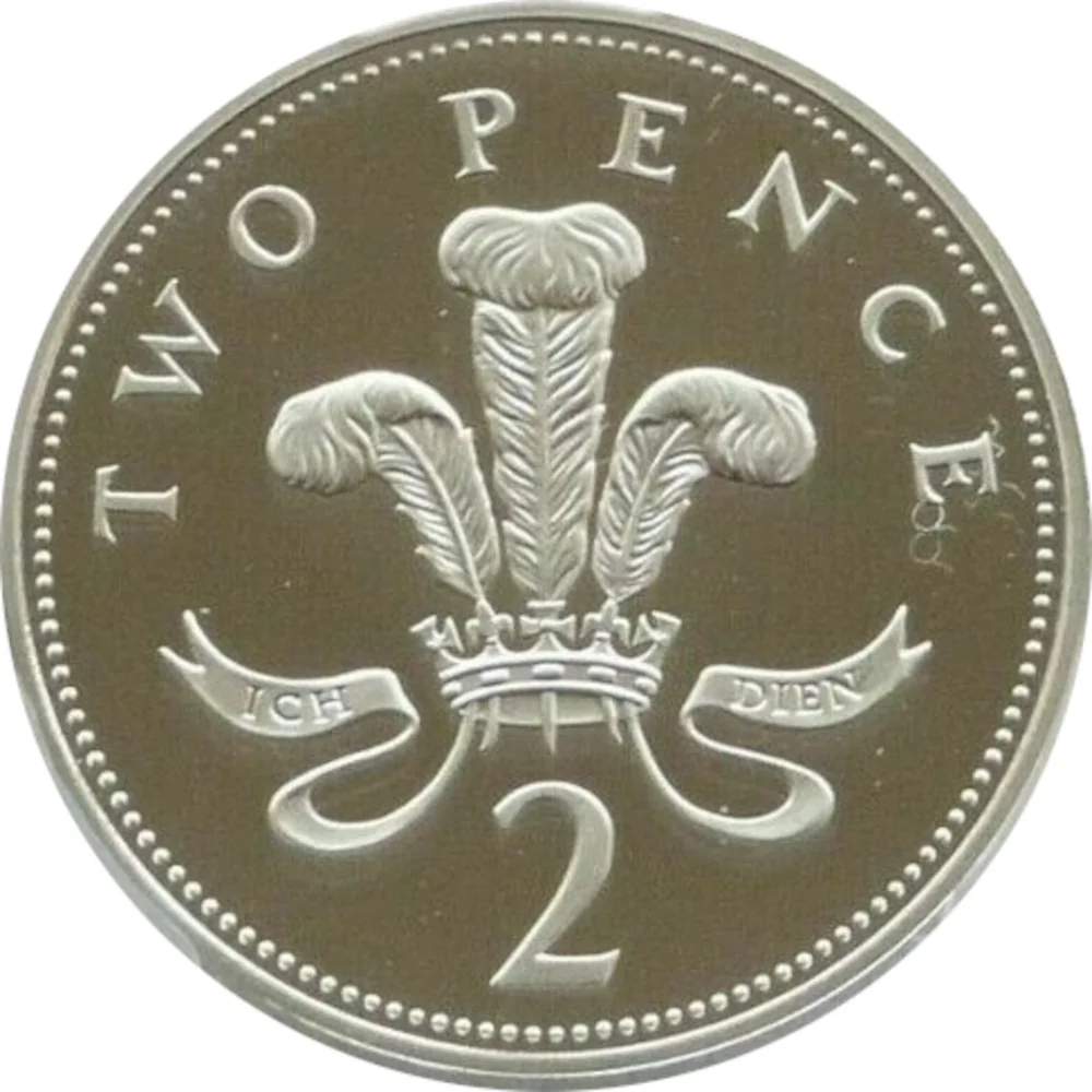 A plume of three ostrich feathers through a coronet, dividing the motto, with legend above and denomination below.
