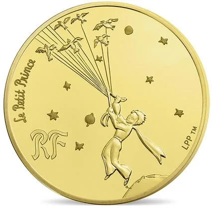 The Little Prince's head encircled by multilingual titles, alongside the face value and year.