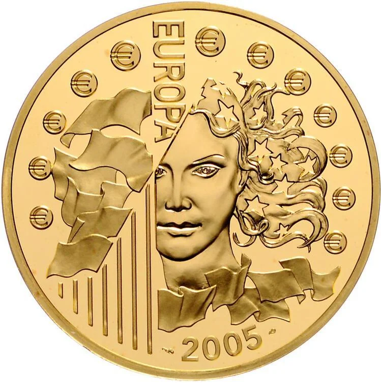 Portrait of Europa with starry hair, above an arc of twelve "€" symbols. To the left, European flags on woven mats.
