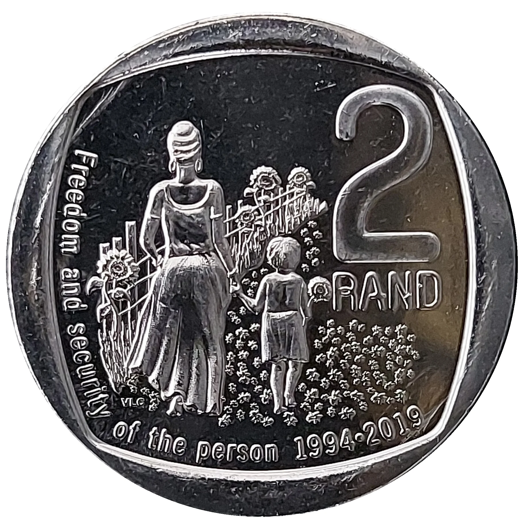 South Africa's coat of arms with ethnic languages flanking it and the date above.