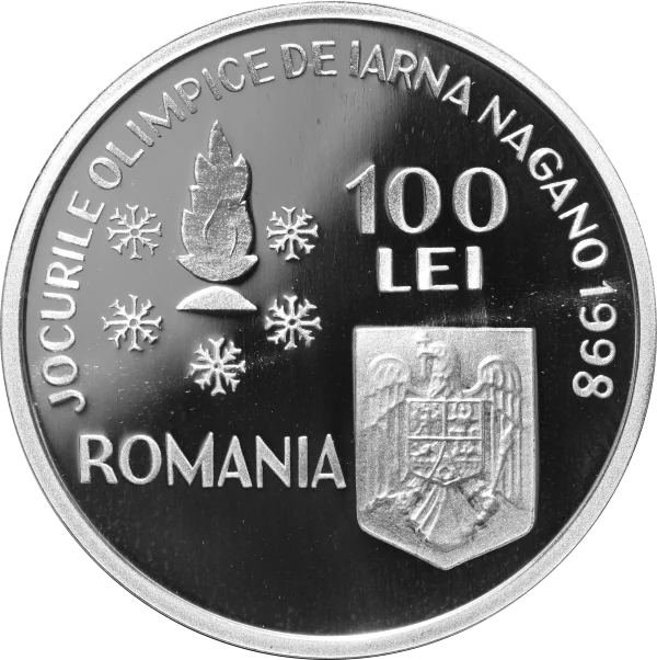 100 LEI, 1996. Features the Olympic flame, five snowflakes, Romania's coat of arms, and the inscription "NAGANO WINTER OLYMPIC GAMES 1998."