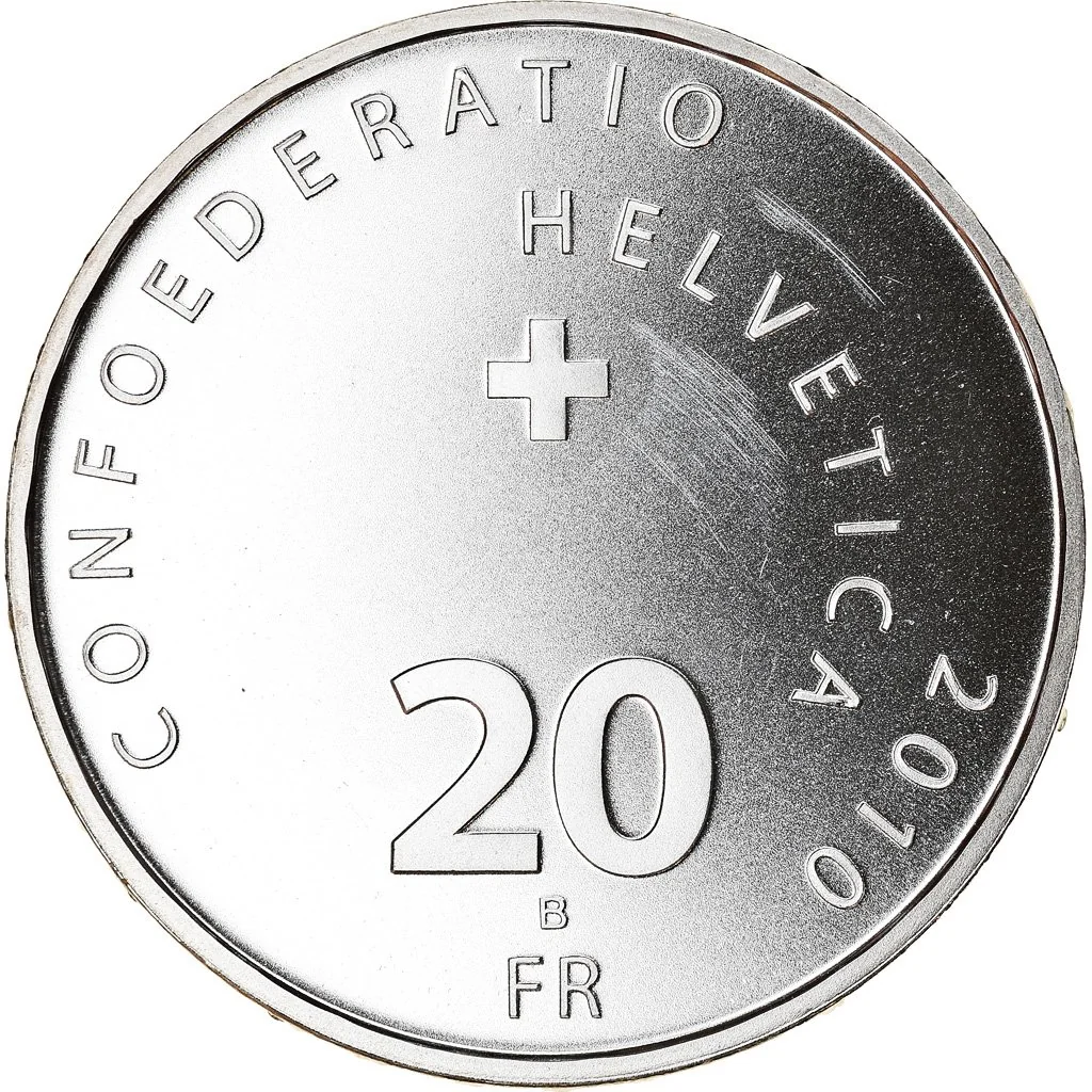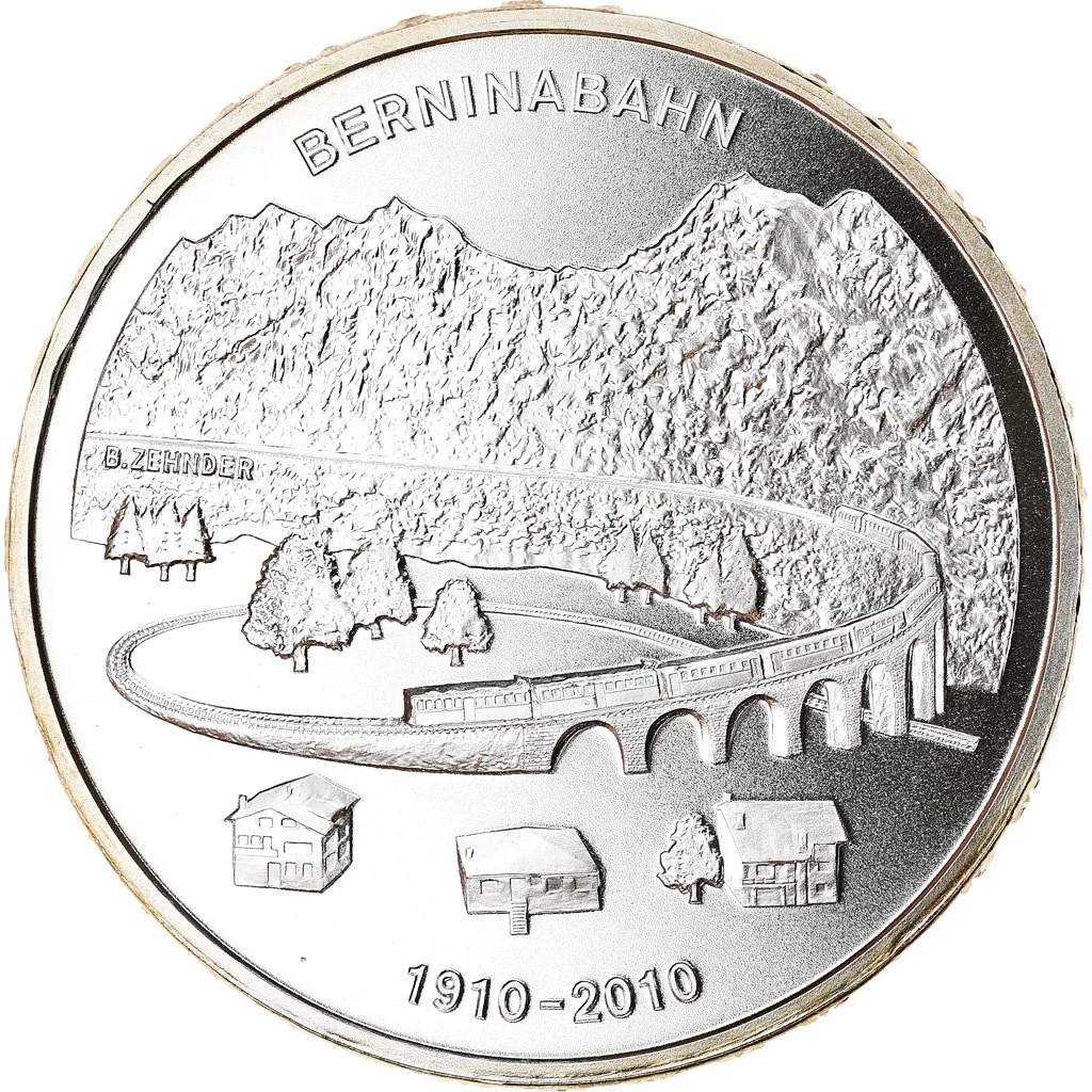 Train climbing Berninabahn viaduct with nine carriages. Houses and trees below, mountains behind.