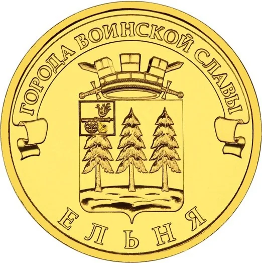 The Yelnya coat of arms, above it the ribbon inscription "ГОРОДА ВОИНСКОЙ СЛАВЫ" (Towns of Martial Glory), below the rim inscription "ЕЛЬНЯ" (Yelnya).