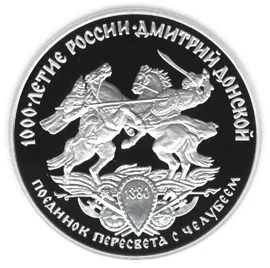 Description: Reverse: Russian and Mongolian warriors Peresvet and Chelubey in single combat. Below, a cartouche of arms and armor with the date "1380" on a central shield. Rim inscriptions: above – "1000-ЛЕТИЕ РОССИИ - ДМИТРИЙ ДОНСКОЙ", below – "ПОЕДИНОК ПЕРЕСВЕТА С ЧЕЛУБЕЕМ".