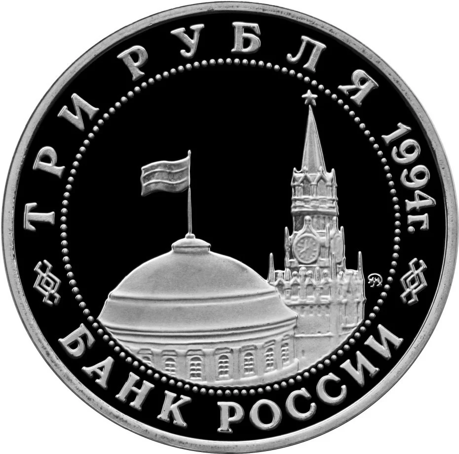 Obverse: The Senate dome and Spasskaya Tower of the Moscow Kremlin; to the right, the mint mark. Rim inscriptions: "THREE ROUBLES 1994" above, "BANK OF RUSSIA" below, within an ornamental border.