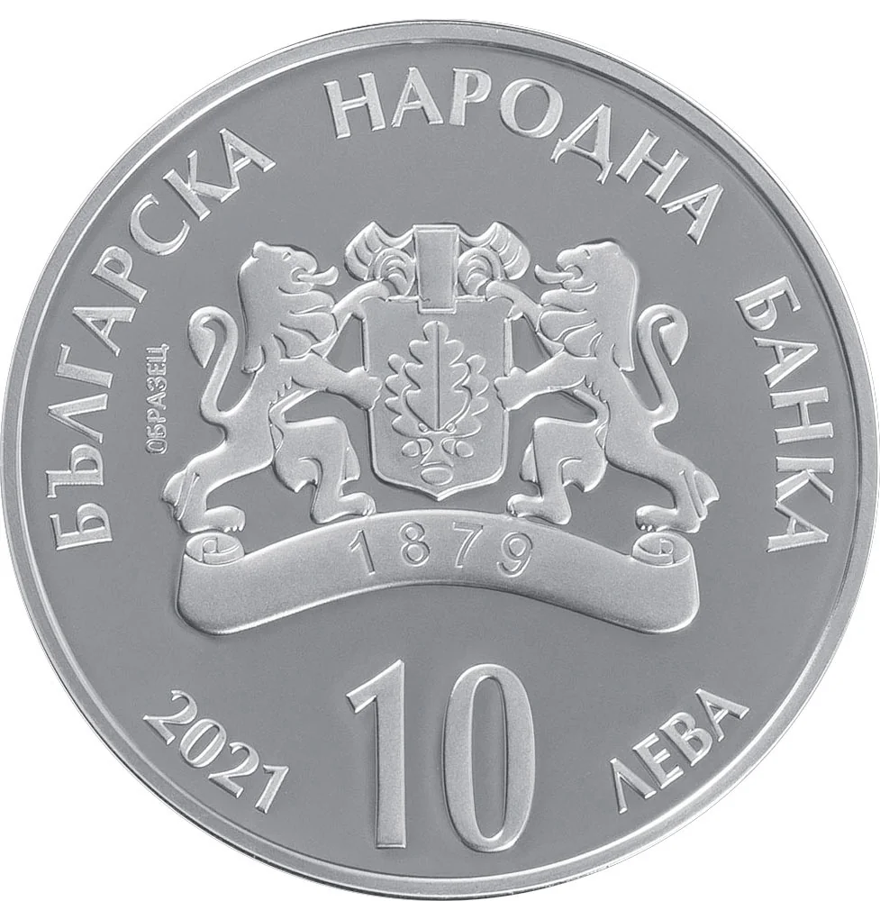 The obverse shows the BNB logo and '1879' on a strip, with 'БЪЛГАРСКА НАРОДНА БАНКА' arched above and '10 ЛЕВА 2021' below.