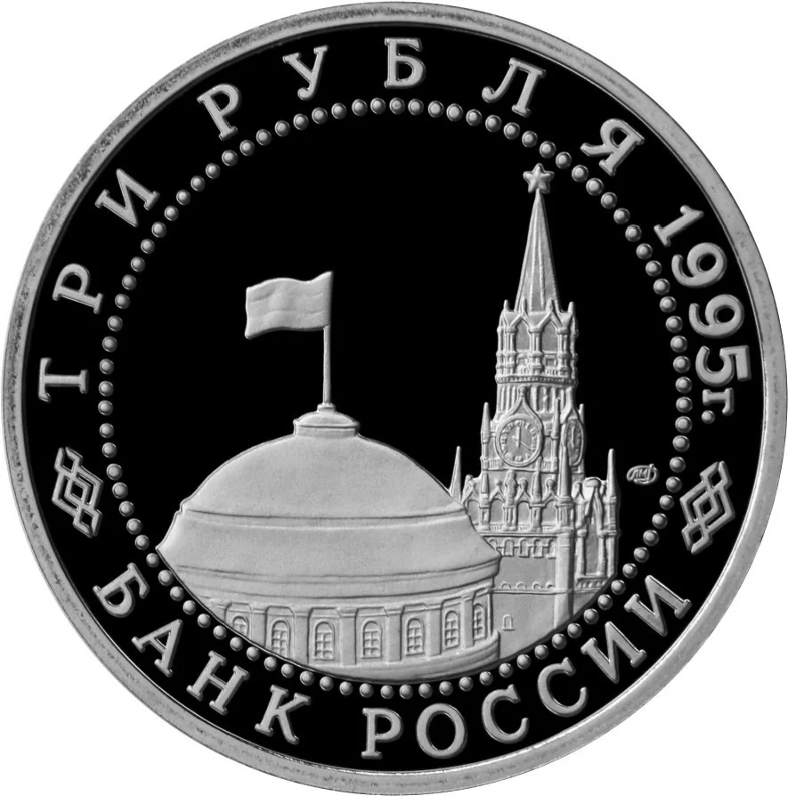 Central: Senate dome and Saviour's Tower of the Moscow Kremlin. Right: Mint mark. Rim inscriptions within dotted circle: top — "THREE ROUBLES 1995", bottom — "BANK OF RUSSIA".