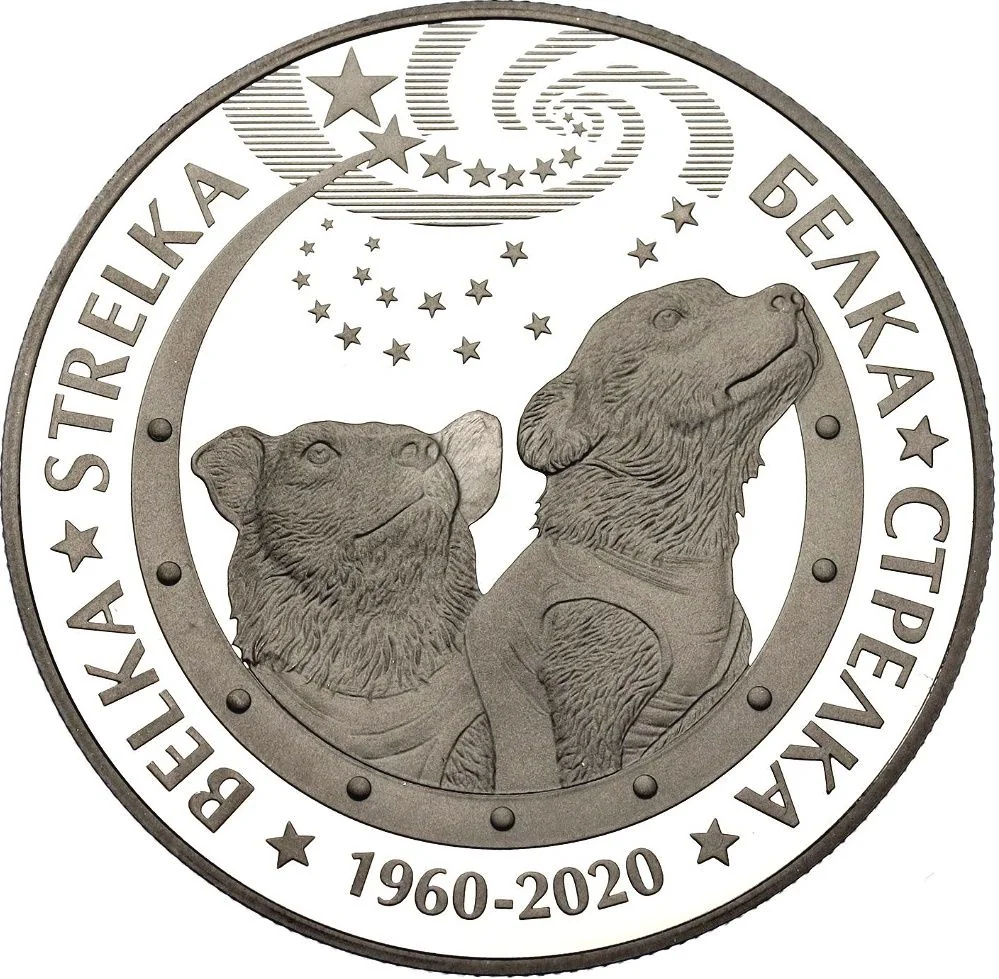 The obverse features Belka and Strelka in a stylized capsule, with a galaxy above. Surrounding inscriptions include their names in Russian and English, and the anniversary dates "1960-2020".