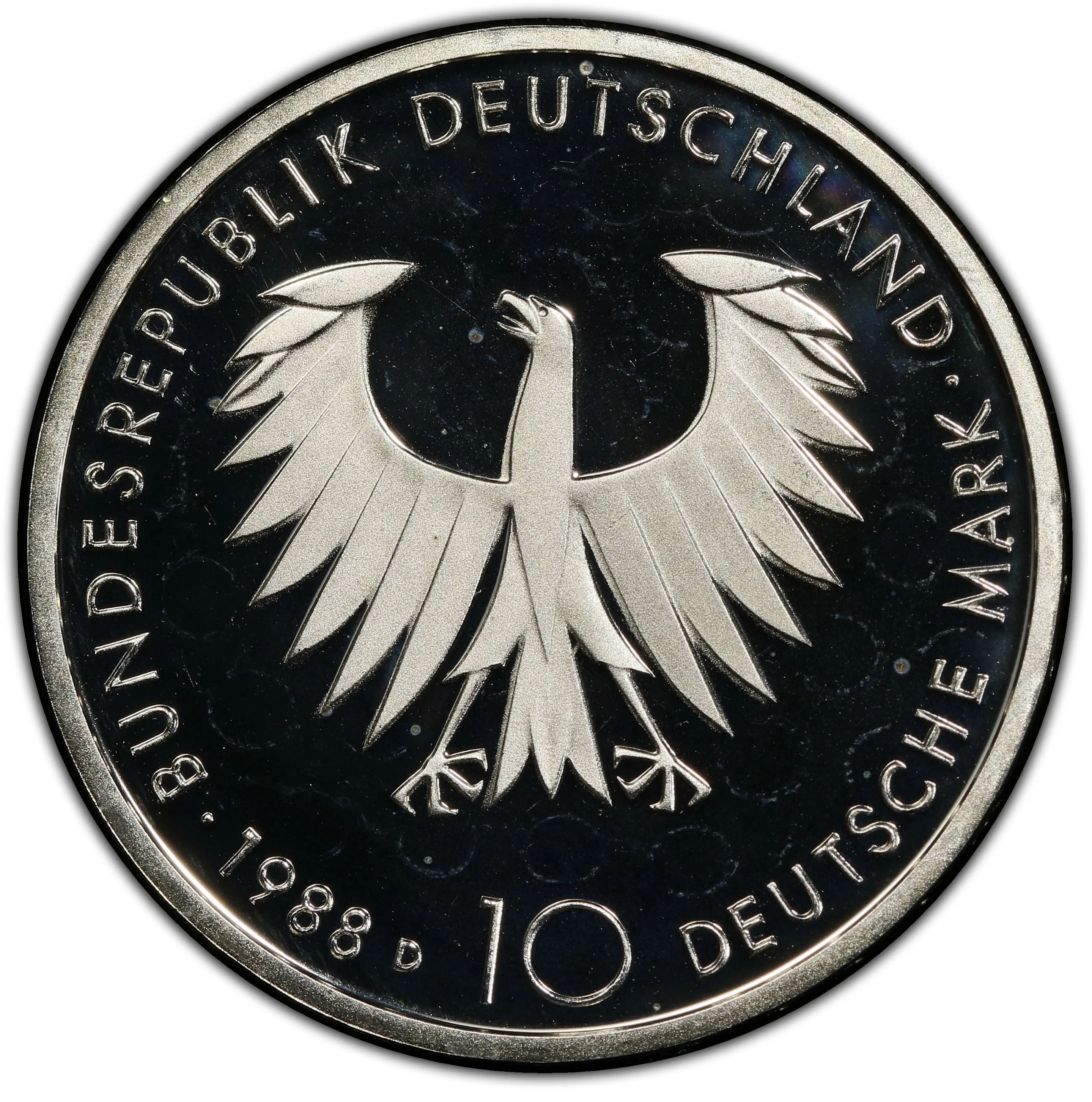 German Federal Republic eagle emblem. Munich mint (D). Face value and issue date.