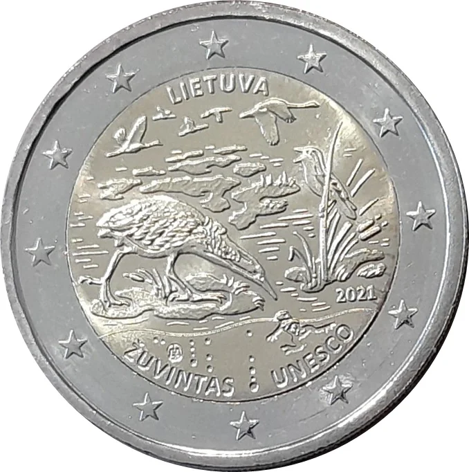 The design depicts the unique wetland landscape of the Žuvintas Biosphere Reserve, a UNESCO site, featuring its islands and distinctive wildlife. It shows a great bittern reaching for a fire-bellied toad, with an aquatic warbler in the rushes, a flock of common cranes, and a mute swan. Inscriptions include LIETUVA, ŽUVINTAS, UNESCO, 2021, and the mintmark. Designers: Eglė Ratkutė and Ernestas Žemaitis. The outer ring features the 12 stars of the European flag.