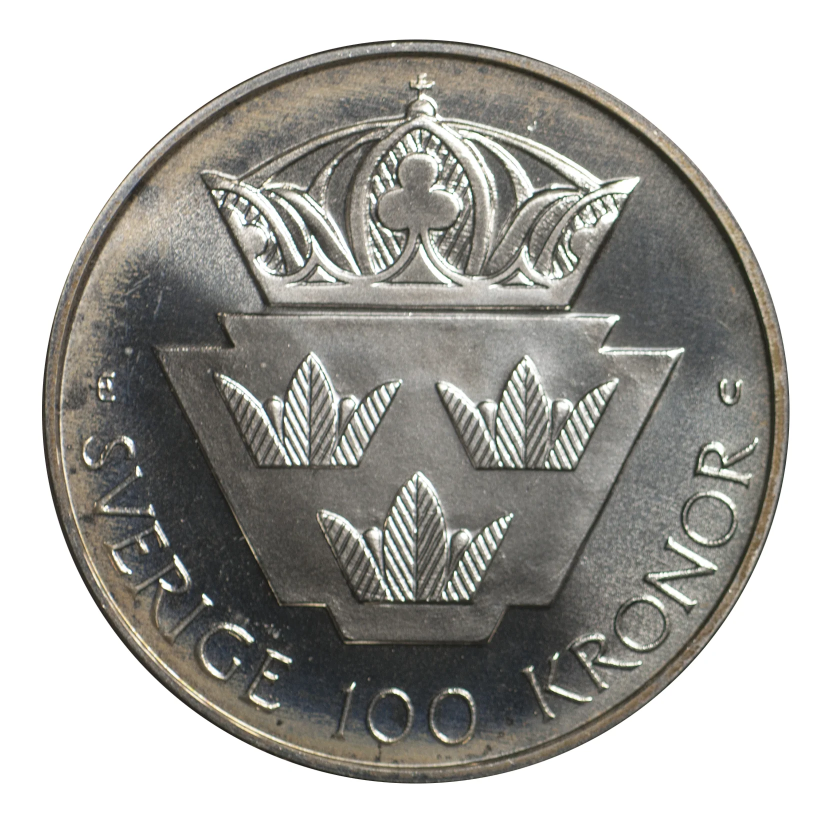 Three crowns on a shield (Sweden's coat of arms). The flanking letters E (Eskilstuna mint) and U (Riksbank Governor's surname initial) frame the value.