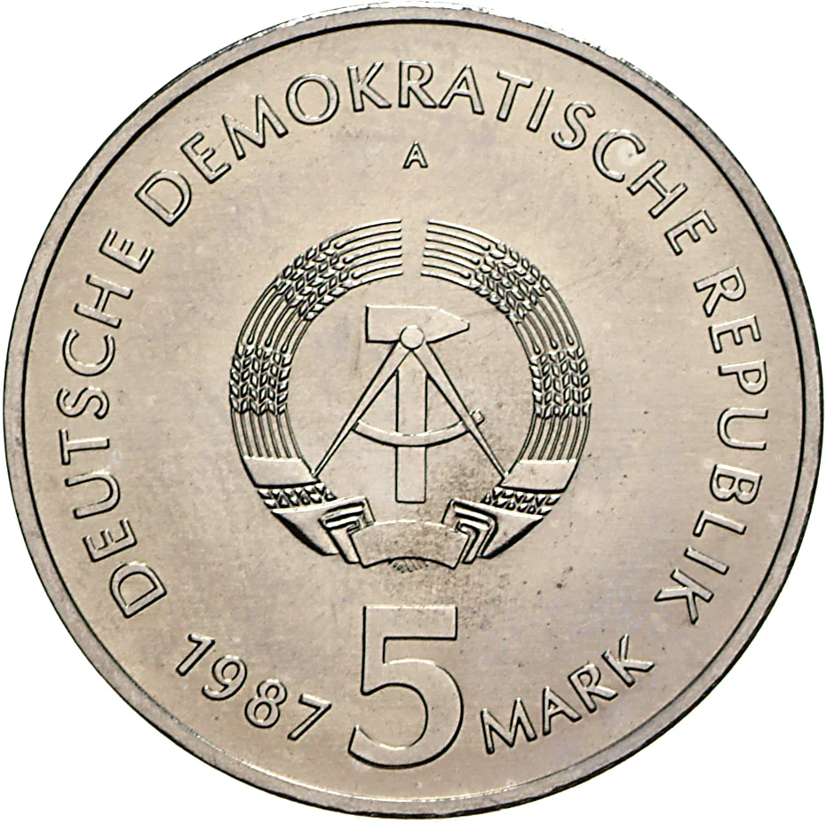 East German emblem, Berlin mint (A), with date and value.