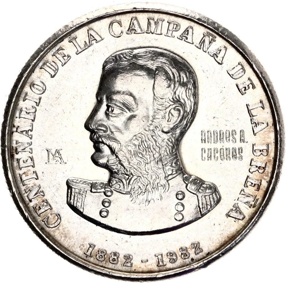 Description: The Peruvian coat of arms features three fields: a blue section with a vicuña (animal kingdom), a white section with a cinchona tree (vegetable kingdom), and a red section with a cornucopia spilling coins (mineral kingdom).