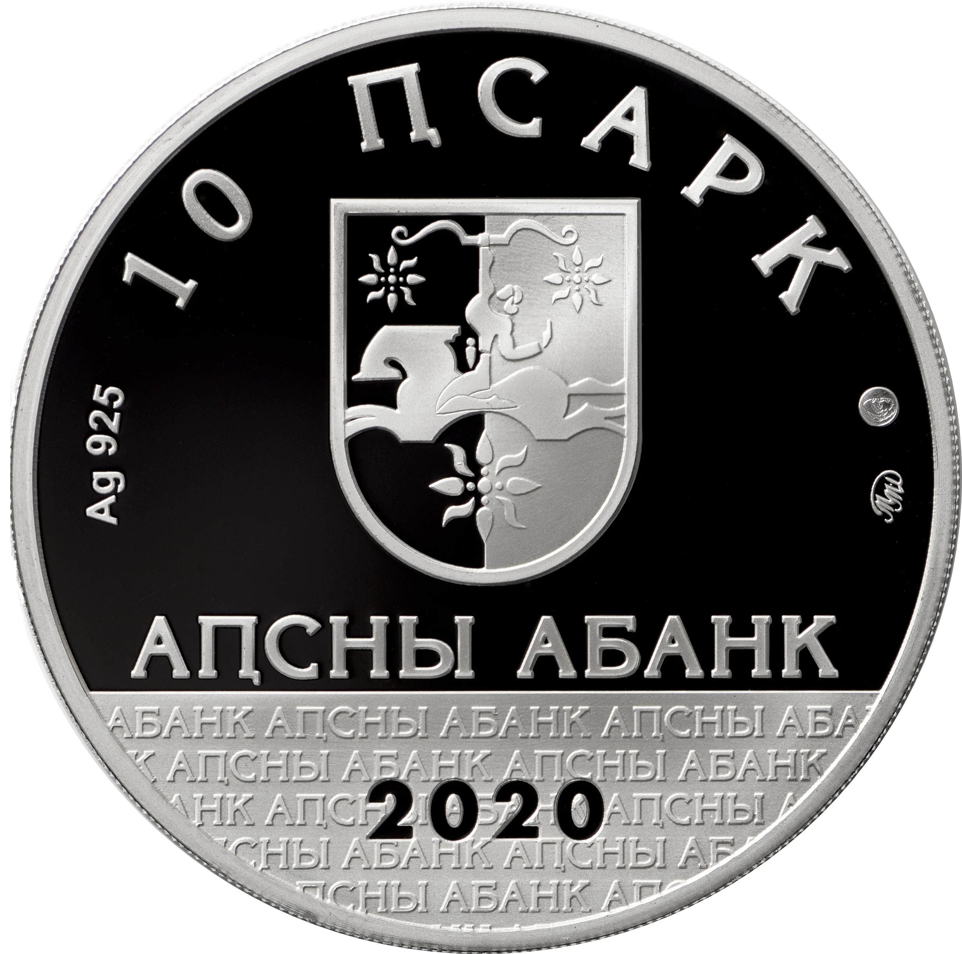 The national emblem of Abkhazia is centered above the Abkhaz inscription "Apsny Abank," with the denomination "10 apsars" above it. The mint year 2020 is at the bottom.