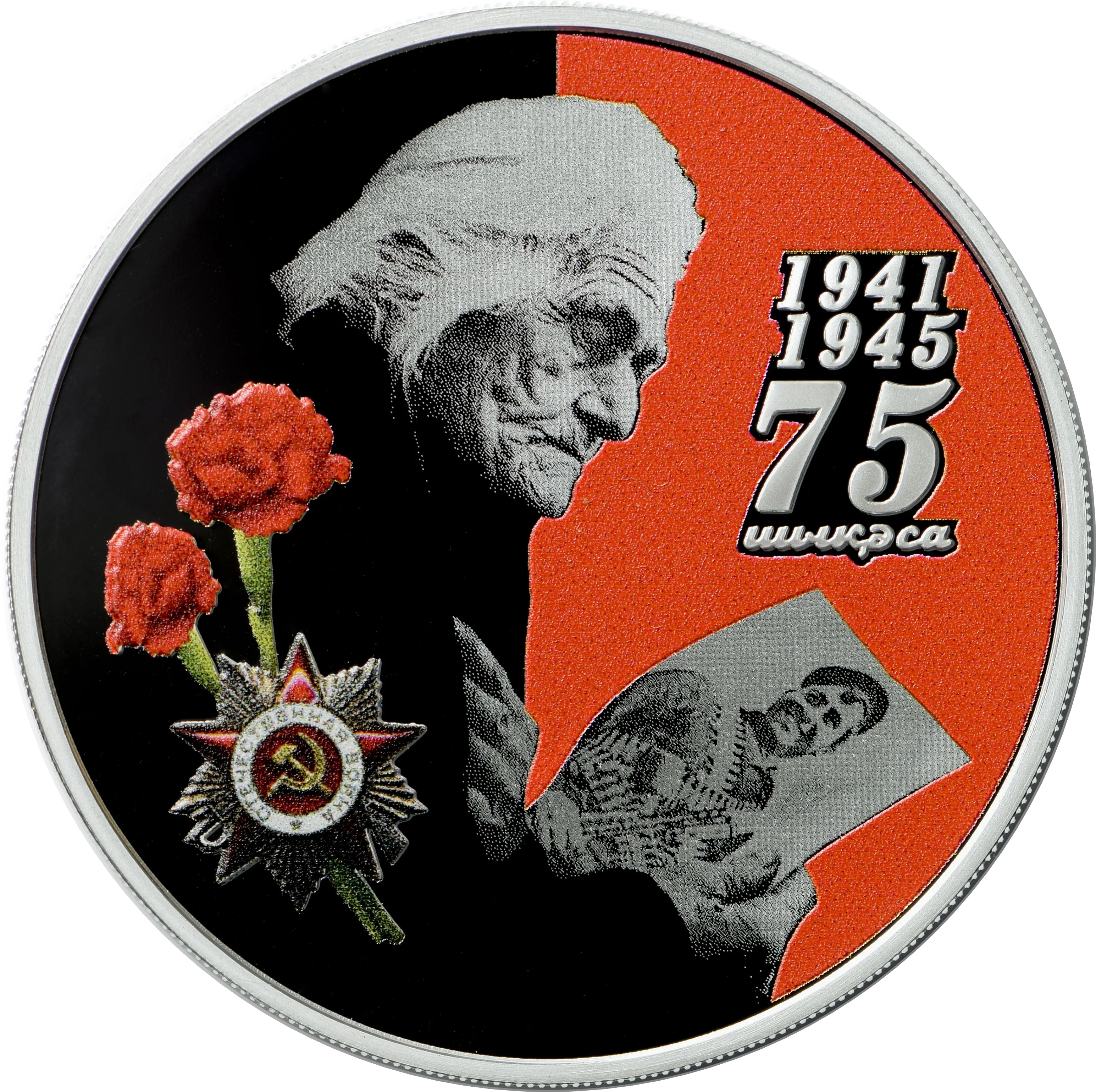 The reverse features S. Korotkov's photograph "Mother," depicting Abkhaz woman Marushcha Pachulia holding a portrait of her son Alexei Arshba, who died heroically in the 1942 Sevastopol battle.