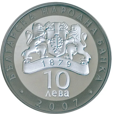 The inner circle shows the Bulgarian National Bank emblem with '1879' on its ribbon and '10 ЛЕВА'. Around the outer circle are 'БЪЛГАРСКА НАРОДНА БАНКА' and the issue year '2007'.