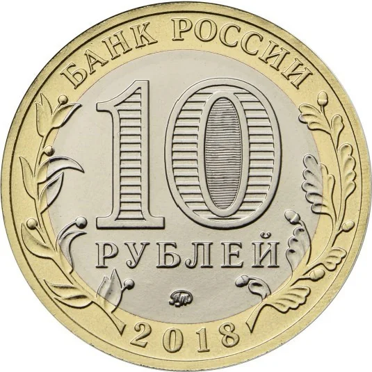 The obverse features "БАНК РОССИИ" (BANK OF RUSSIA) above and "2018" below. Stylized laurel and oak branches flank the outer ring. The central disc displays "10 РУБЛЕЙ" (10 ROUBLES). The "0" contains a hidden "10" and "РУБ" (RUB) visible at different angles. The mint mark is at the disc's bottom.
