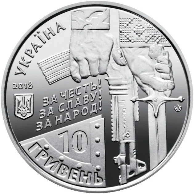 Above left: the semicircular inscription "УКРАЇНА," the year 2018, and Ukraine's small coat of arms. Center: a stylized composition of two male hands holding weapons from different eras, symbolizing Ukraine's defenders throughout history. The background bears the inscription: "ЗА ЧЕСТЬ! ЗА СЛАВУ! ЗА НАРОД!" Below left, against a shield fragment, is the face value 10/ГРИВЕНЬ; to the right is the NBU Mint mark.