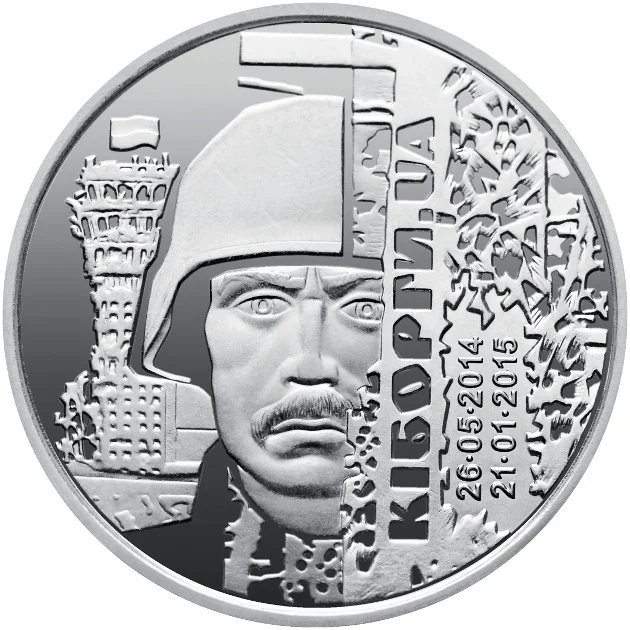 A conventionalized composition shows an airport defender before a half-ruined control tower flying a Ukrainian flag. To the right are bullet-ridden metal structures with the vertical text: КІБОРГИ. UA/ 26•05•2014/21•01•2015 (CYBORGS. UA/ 26•05•2014/21•01•2015).