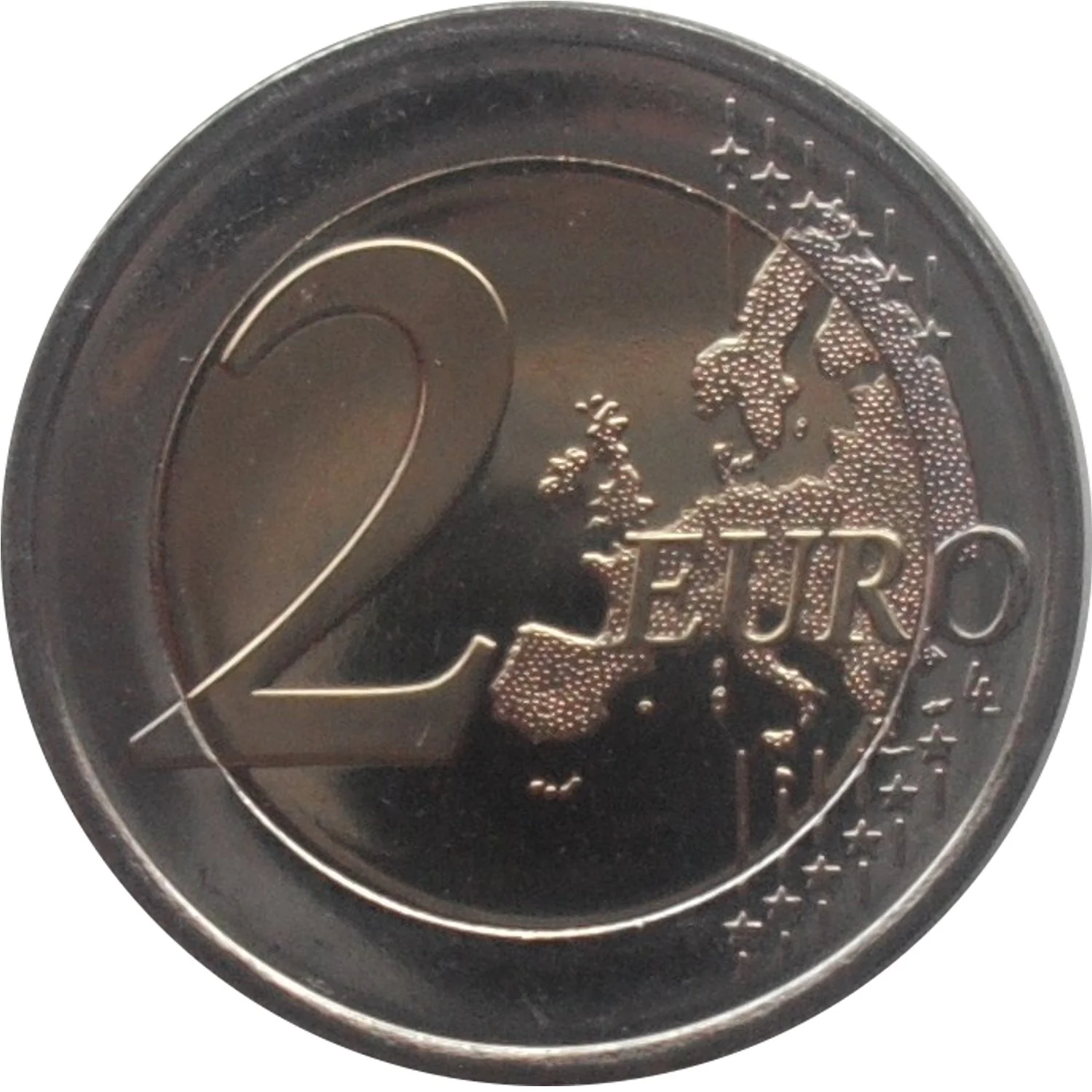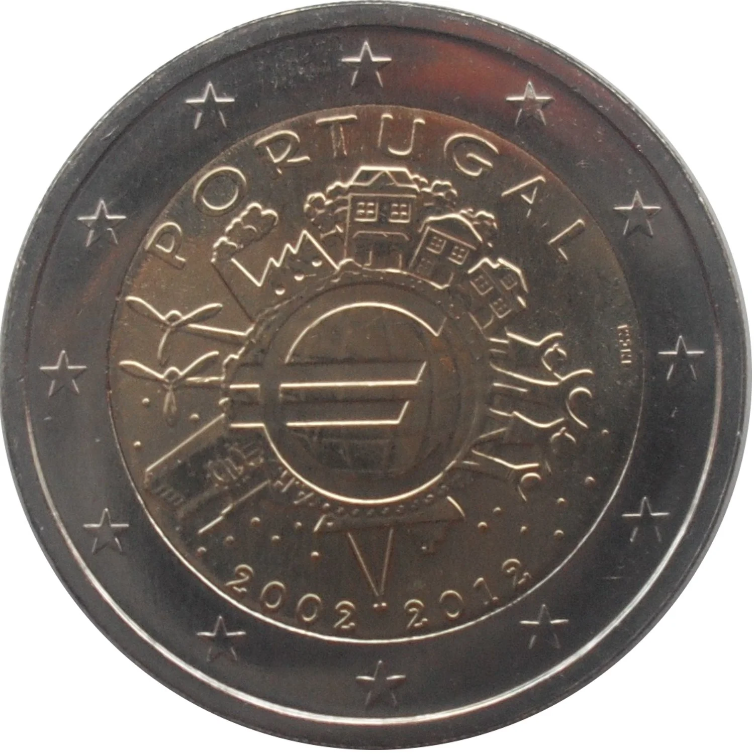The coin's centre shows the world as a euro symbol, marking its global role. Surrounding elements depict the euro's importance to people (a family), finance (the Eurotower), trade (a ship), industry (a factory), and energy/R&D (wind turbines). The designer's initials "A.H." are between the ship and tower. The inner part bears the issuing country and the years "2002–2012". All euro area countries will issue it. The outer ring features the EU's 12 stars.