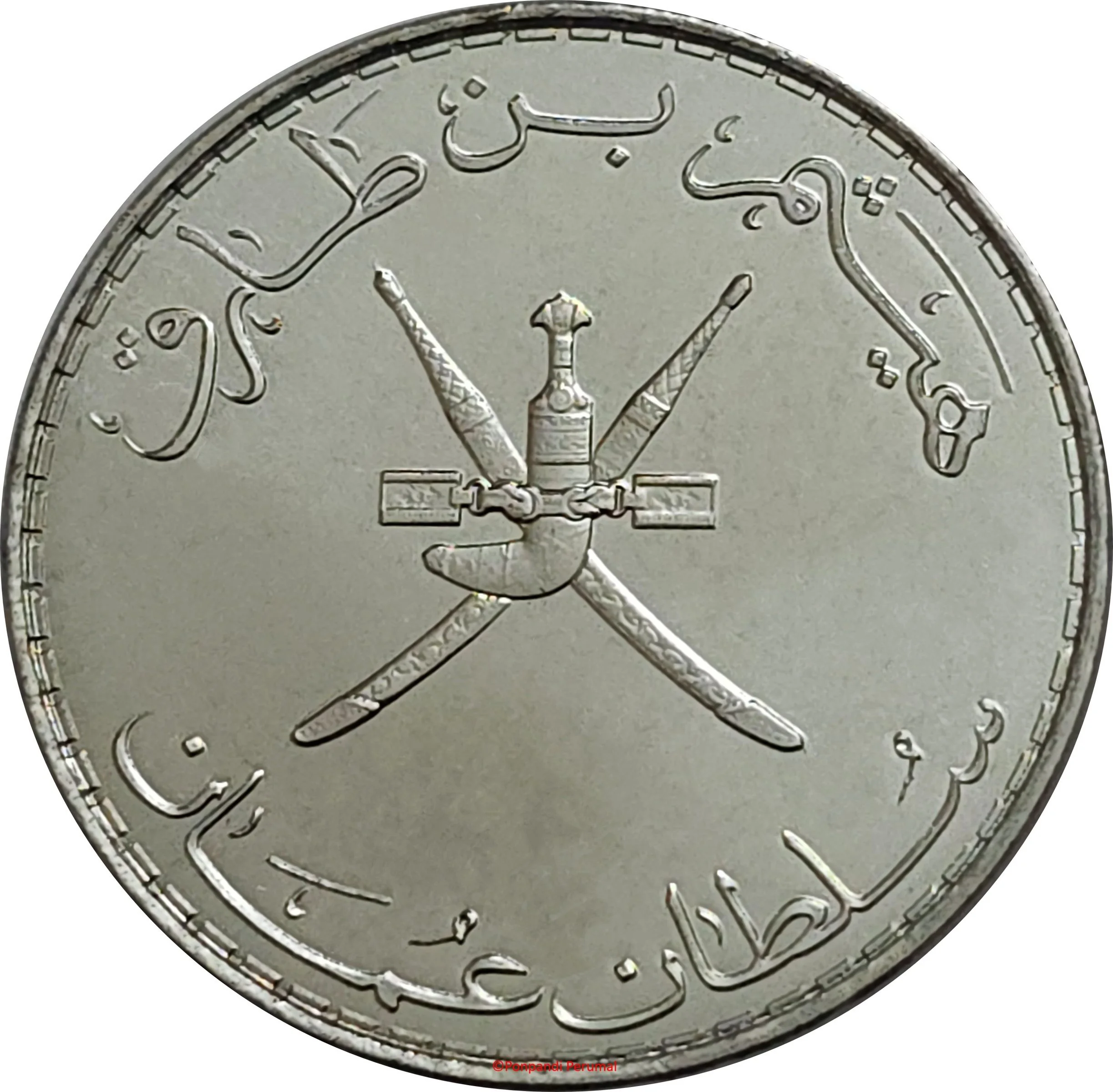 The Sultan's name above Oman's national emblem, with "Sultanate of Oman" below.
