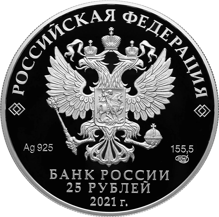 The disc's mirror field features the Russian Federation coat of arms. Above it, along the rim, is the semicircular inscription "РОССИЙСКАЯ ФЕДЕРАЦИЯ," flanked by doubled rhombuses. Below the coat of arms are the metal/fineness on the left and the fine metal content/mint mark on the right. Centered at the bottom are three lines: "БАНК РОССИИ," "25 РУБЛЕЙ," and "2021 г."