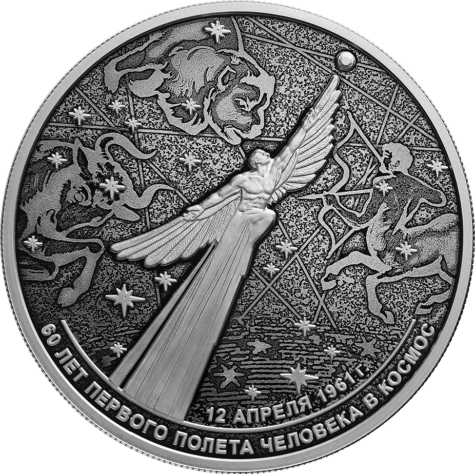 The disc's mirror field features a winged human figure and a star, set against a stylized starry sky with the zodiac constellations Taurus, Leo, and Sagittarius. The rim is inscribed with ‘12 АПРЕЛЯ 1961 г.’ and ‘60 ЛЕТ ПЕРВОГО ПОЛЕТА ЧЕЛОВЕКА В КОСМОС’.
