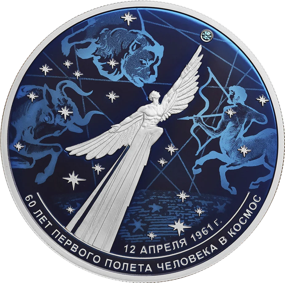 The disc's mirror field features a winged human figure and a star, set against a stylized starry sky with the zodiac constellations Taurus, Leo, and Sagittarius. The rim is inscribed with ‘12 АПРЕЛЯ 1961 г.’ and ‘60 ЛЕТ ПЕРВОГО ПОЛЕТА ЧЕЛОВЕКА В КОСМОС’.