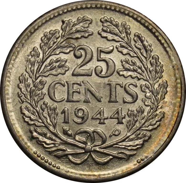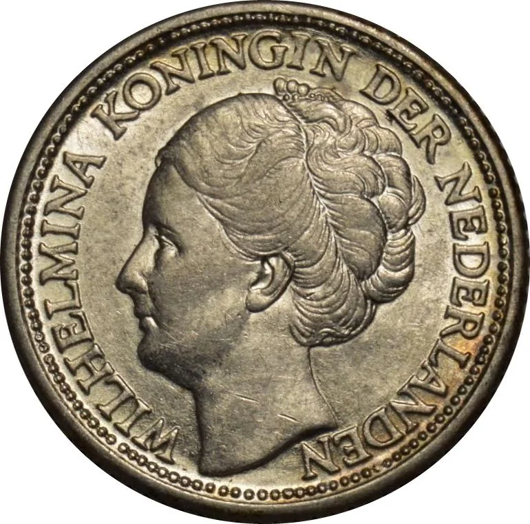 Queen Wilhelmina facing left, with raised hair. Lettering encircles.