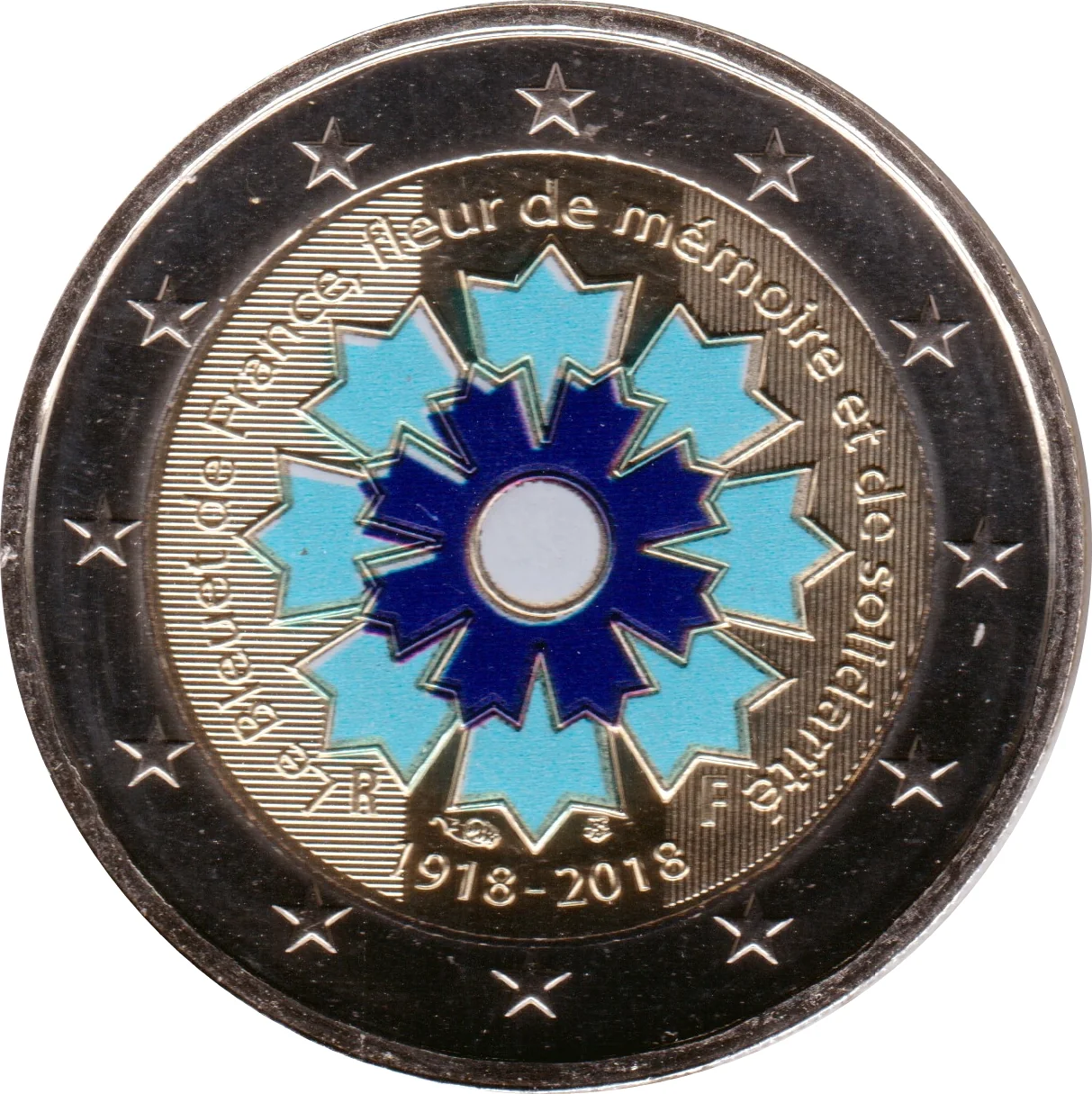 The coin centers on a colored cornflower, encircled by "Le Bleuet de France, fleur de mémoire et de solidarité." It also includes the dates "1918-2018," the letters "RF," and the mint marks.