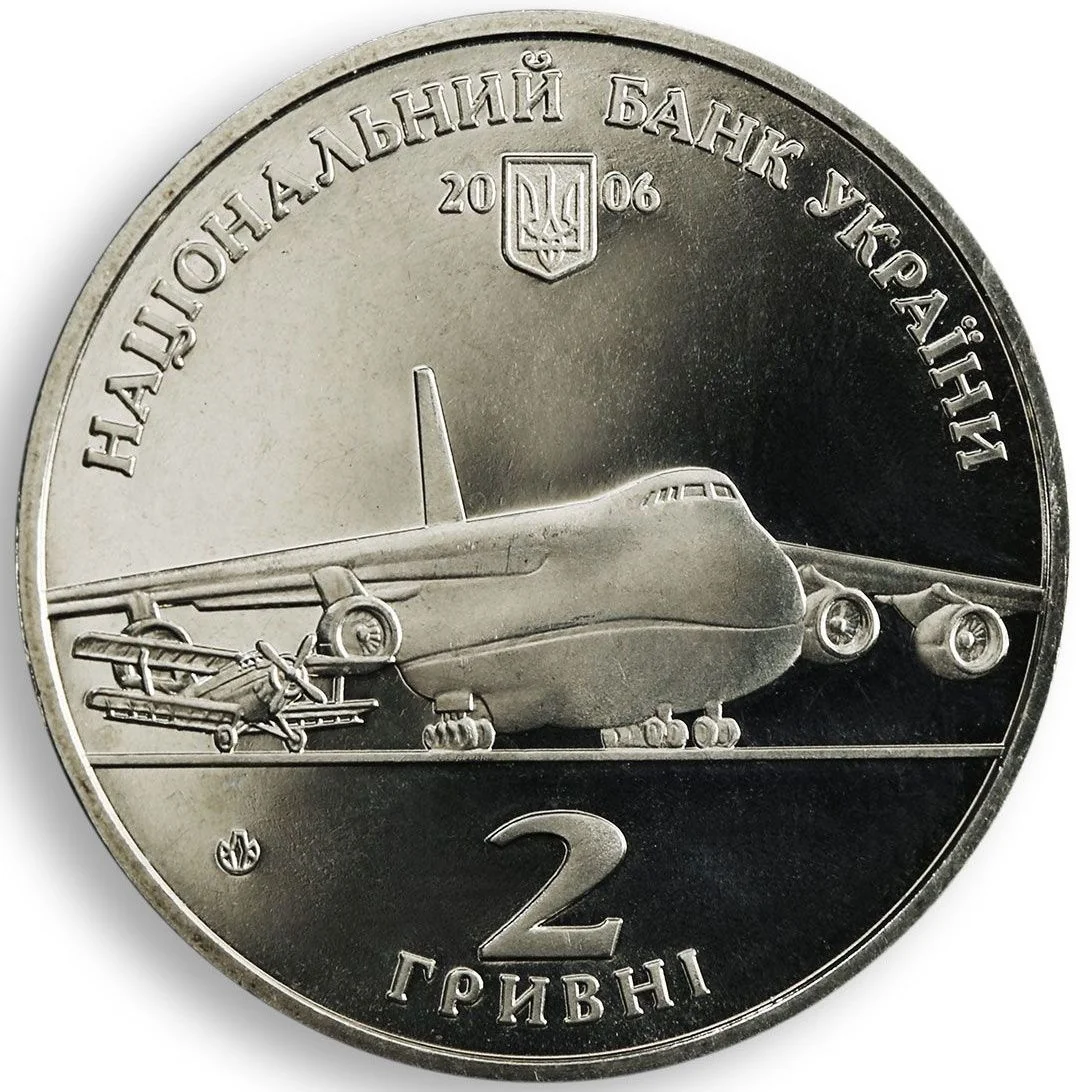 Centered airplanes (AN-2 and AN-124 "Ruslan") are shown above the coin's denomination "2 ГРИВНІ". Above them, a semicircular inscription reads "НАЦІОНАЛЬНИЙ БАНК УКРАЇНИ", accompanied by Ukraine's small State Emblem, the year 2006, and the Mint's logotype.